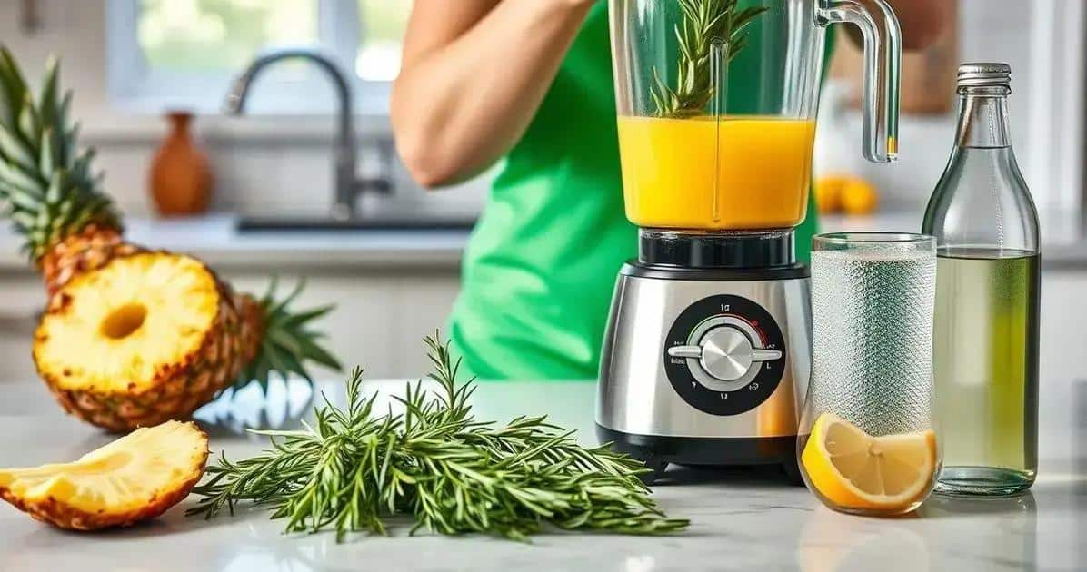 - Mescolamento: In un frullatore, aggiungi il succo di ananas, il succo di limone e il rosmarino. Se desideri una bevanda più dolce, puoi anche aggiungere zucchero di canna a piacere.